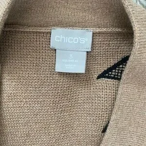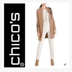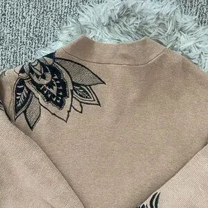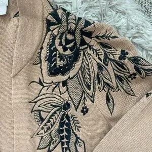 Elegant camel long cardigan with a striking black floral embroidered design. Ideal for chic layering. This cardigan can be dressed up or down. Long sleeve. Ribbed collar. Front hook closure. Left shoulder and right sleeve have a beautiful black embroidered floral design. Color: Camel. Chico’s size 3 is a US 16. See size chart. Pit to pit 23” Length 35”. No stains, snags or holes. Open to offers. Quick ship.