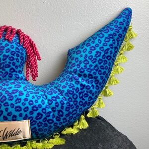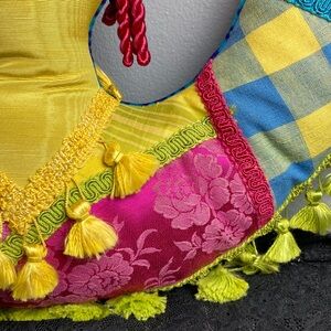 Add a vintage (OOAK) one of a kind vibrant multicolor touch to your home with this colorful patchwork decorative pillow. Featuring a mix of yellow, blue, pink, and green, this pillow is perfect for brightening up any space. It is Approximately 22”across & 13.5” deep