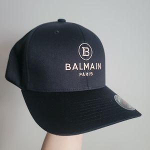 Stylish black cap with gold Balmain logo. Perfect for casual wear.