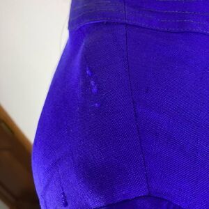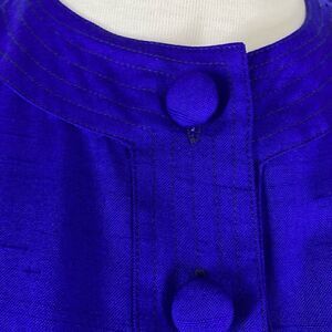 This playful 80’s take on a 40’s style features a round embroidered buttoned neckline, large bold shoulders, long cuffed sleeves, nipped in waist with attached half back belt, side pockets and pencil skirt. All in a lovely cobalt blue slub woven silk.