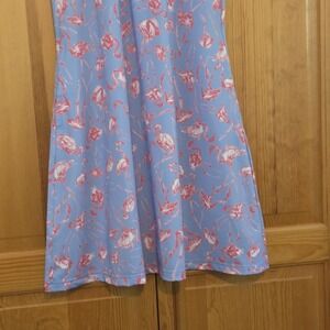 The AnaClare Active Dress in size S is a vibrant and stylish addition to any woman's wardrobe. Featuring a fun flamingo pattern in pink, this periwinkle blue sleeveless shift dress with a round neck and pullover closure is perfect for travel or casual occasions. Made from a comfortable blend of polyester and spandex with a knit fabric type, this knee-length dress is lightweight and stretchy, making it ideal for the summer and spring seasons. The dress also accents a zipper detail, adding a touch of flair to a classic beach-themed design.