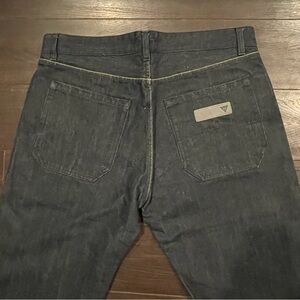 Men’s riding jeans in dark washed blue denim.