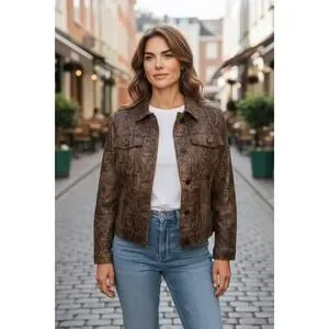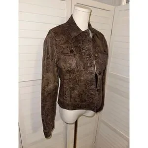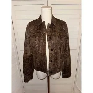 Keywords: denim jacket, snake print, animal print, statement jacket, fashion jacket, western chic, moto style, edgy, stylish, layering piece, designer jacket, brown jacket, textured jacket