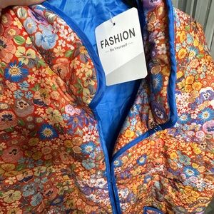 Vibrant floral quilted jacket with blue trim. Perfect for adding a pop of color.