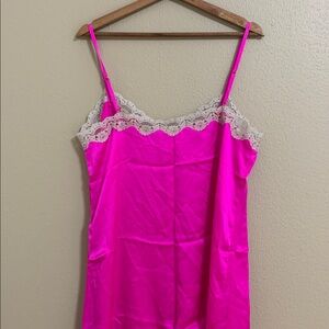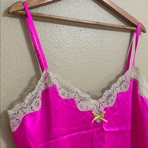 Vibrant hot pink chemise featuring delicate beige lace trim. Adjustable straps and a cute bow detail.