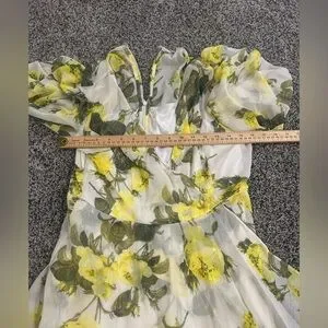 Embrace elegance with this floral yellow wrap dress. Perfect for any occasion, it features a flattering silhouette and vibrant floral design.