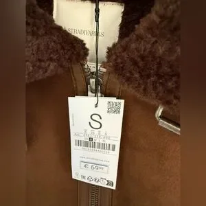 Stylish brown shearling aviator jacket with zip pockets and buckle details. Perfect for a chic look.