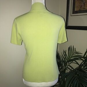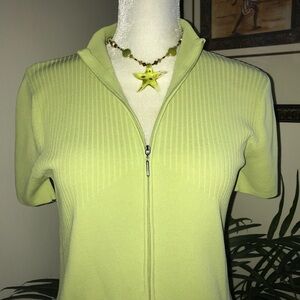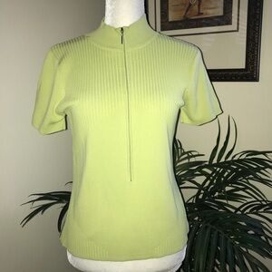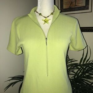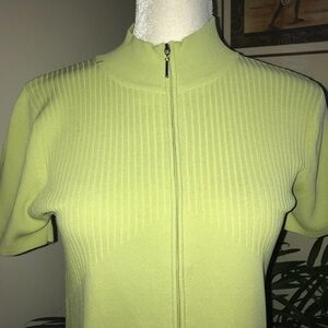 Gorgeous light green stretch knit top. Mock Style collar with 3/4 zipper down the front. Simply beautiful. This is sleek and will mold to your body for a wonderful silhouette. Chest 36 before stretch. Length approx 21 1/2 in M