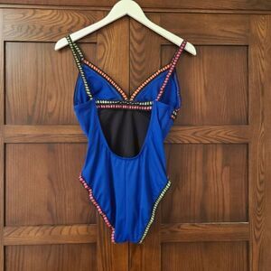 La Blanca Threading Along One Piece Swimsuit in Royal Blue. No underwire but removable cups give a little shape and support.