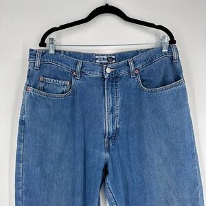 Although these are men’s jeans, they are Listed in men’s and women’s. Measurements shown. No size tag or materials. Based on age, I would assume these are 100% cotton.