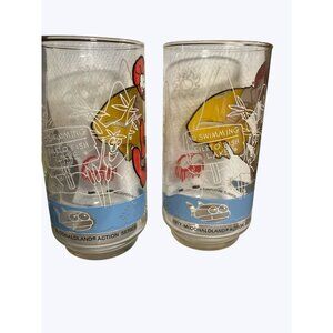 These vintage McDonald's collectible glasses from 1977 offer a nostalgic glimpse into mid-70s restaurant memorabilia. Featuring a vibrant graphic design of Ronald McDonald in his iconic yellow, red, and white outfit, these glasses showcase the playful branding of the era. The detailed illustration captures Ronald in a dynamic pose against a blue background, making them both a functional drinkware item and a sought-after collector's piece.