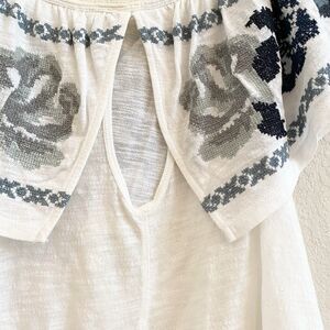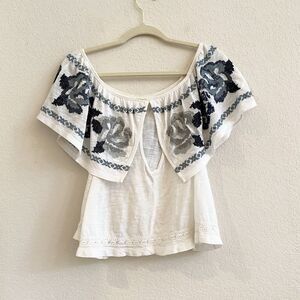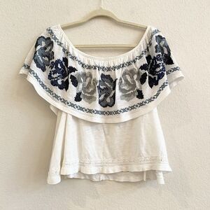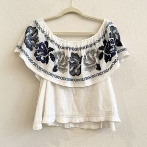 Free People To The Left Blouse Off Shoulder Ruffle Embroidered Ivory Blue Sz XS