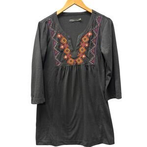 prAna Blouse Womens Medium Black V-Neck Tunic Top 3/4 Sleeve Embroidered Boho