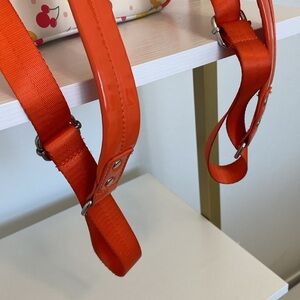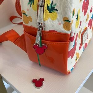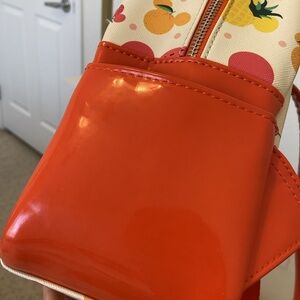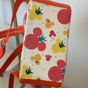 Vibrant Loungefly backpack with Disney fruit pattern. Features red, yellow, and orange accents. Perfect for Disney fans.