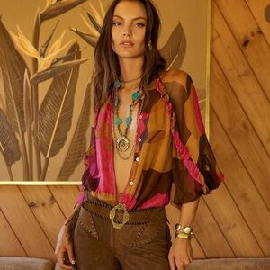 Chasing Unicorns Silk Chiffon Vibrant Pink and Brown Ruffle Blouse Size Medium
