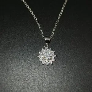 Beautiful 1-carat moissanite pendant in a sparkling snowflake-inspired halo design. Set in solid S925 sterling silver and paired with an 18-inch chain. The stone has amazing fire and brilliance—looks just like a real diamond!