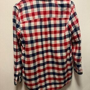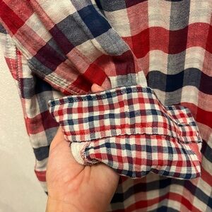 Stylish plaid button-up shirt. Features red, white, and blue checkered pattern. Perfect for casual wear. Size: Small in great condition. Light weight. Bin k