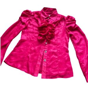 Vintage Retro 80s Style Hot Pink Ruffle Front Puffed Sleeve Button Up Blouse XS