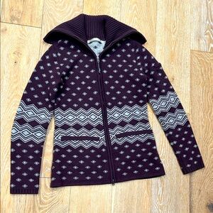 Athleta purple gray Nordic wool blend full zip Teton Fair Isle Sweater. Excellent preloved condition!