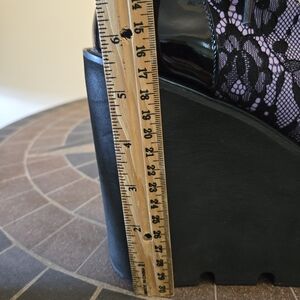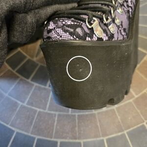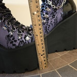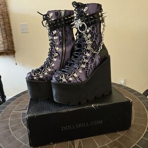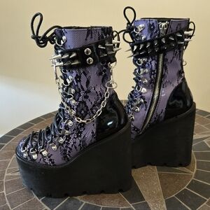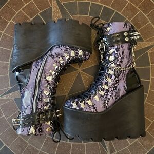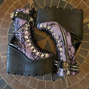 Purple and black Widow Dolls Kill Haunted Traitor platform boots with original box included. Lacy motif with spikes and chains. Functional side zipper. These are some fking amazing boots. Some general light scuffs on the platforms and to the heels. Also some small dings to the front areas of the platforms. These are 100% from the strap spikes when in the box. See last photos.