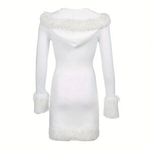 Women’s white, bodycon dress with faux fur trim and hood. Perfect for a winter white party or holiday outfit.