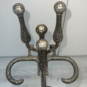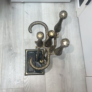 This is a beautiful Vintage Adams Company, Dubuque Iowa Goldtone Black Fireplace Tool Set. Iron and brass combination make this set both elegant and heavy duty. Comes with stand, poker and tongs. Gorgeous and in excellent pre-owned condition.