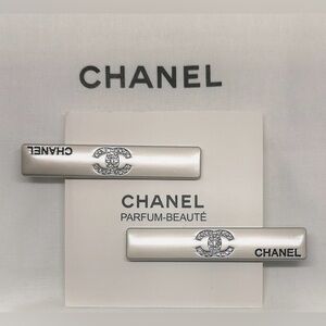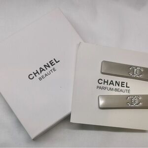 This stylish CHANEL hair clip set includes two rectangular hair clips in silver finish, adorned with rhinestones. Made in FRANCE and features the iconic CC logo. It is made of metal, these clips are perfect for any occasion and designed for women with all hair types. Brand new, in unopened/sealed packaging and comes with the box. This was a gift with purchase (GWP) of Chanel beauty products. Please see the GWP disclosure information on attached image.