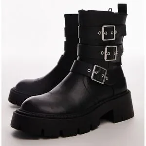 Sleek black moto biker boots by Topshop. Features bold buckle accents.