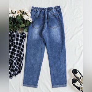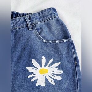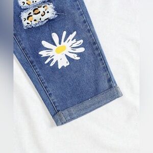 Stylish blue jeans featuring floral embroidery. Perfect for a casual day out.
