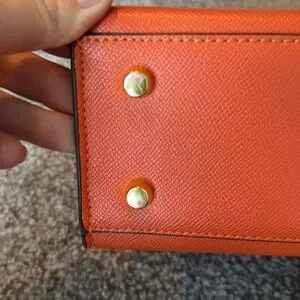 Textured orange leather (cannot confirm if it’s real leather since there is no internal tag, and I bought this a few years ago) - but it feels like real leather.