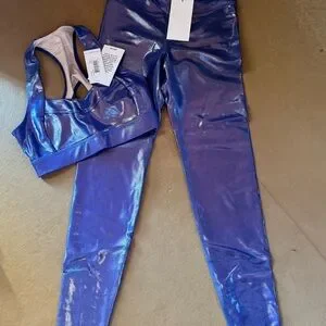 Shiny blue sports bra and leggings set. Sleek and stylish design. Perfect for workouts.