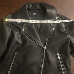 Timeless black leather jacket from GAP. Features sleek design and zippered pockets. Ideal for versatile styling. Never worn besides trying on.