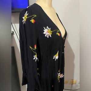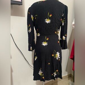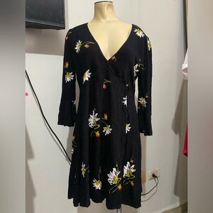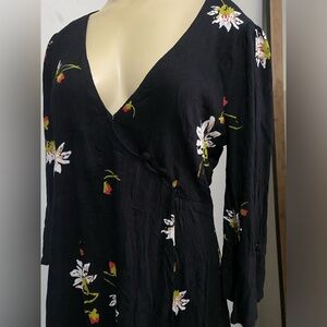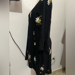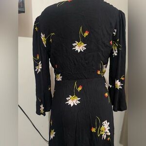 This stunning dress by Free People features a chic black and white color palette with a playful ruffled wrap design. The long bell sleeves and v-neckline add a touch of elegance, making it perfect for a casual night out. Its a-line silhouette ensures a flattering fit, while the lightweight fabric offers comfort and ease of movement.