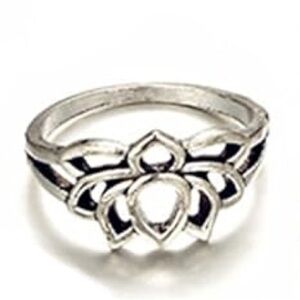 This elegant silver toned lotus ring is a perfect addition to any ring collection. Great condition, mild scratches. Made of a lightweight metal alloy. Labeled size 8.5, but I think it fits like more of a 7.