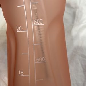 Super cute pink opaque water bottle. On the side it has little motivational sayings next to the number of ounces. The straw is protected by a casing which can lock and you push to pop open. A cleaning brush is included to clean the straw as seen in photos. Brand new, never been used. There is a small marking manufacturing error seen above the “1000” mark, see photos.