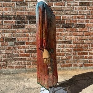 Vibrant, Y2K vintage paisley tunic dress with a tie neckline and rhinestones on the collar. Features a mix of red, orange, and green hues. Sheer. Would be great for a swimsuit cover up!