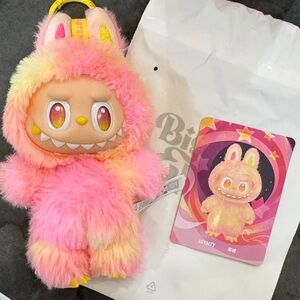 Adorable LABUBU pink furry keychain with a playful design. FUN COLLECTIBLE AUTHENTIC POPMART Perfect for adding charm to your accessories. NEW - CONFIRMED- SEALED BOX