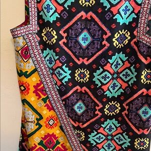 Vibrant mini dress with bold geometric patterns. Features a mix of blue, pink, orange, and black. Perfect for a standout look.