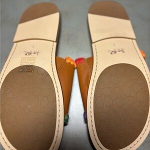 These Coach sandals showcase a rich brown leather design accented by a vibrant red and multicolored braided trim, offering a playful bohemian touch. The embossed Coach logo on the strap adds a touch of elegance, while the molded footbed ensures comfort for all-day wear. Ideal for a casual summer outing, these sandals effortlessly combine luxury with a relaxed style.