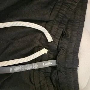 Sleek black joggers by Vuori. Features a white drawstring for adjustable comfort. Ideal for casual outings. Never worn.