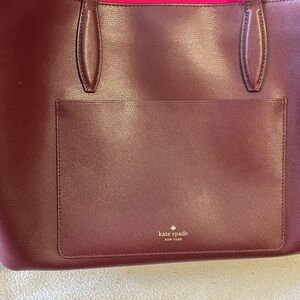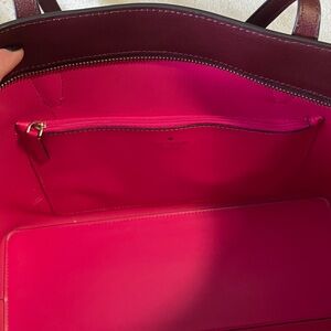 Chic and versatile tote in deep burgundy. Features striking pink accents. Ideal for daily use. Acquired from a friend that never used it. No marks no stains no rips. 10 1/2 inches tall in about 14 1/2 inches wide. I will be listing more Kate Spade bags and totes all new with or without tags. Will include free gift, which is the pink Kate Spade mini cinch bag as pictured.