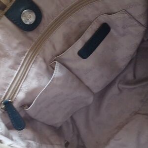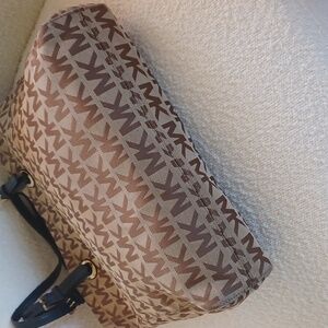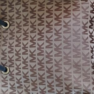 Pre-owned Michael Kors tote bag/shoulder bag in the signature MK pattern. It measures 14" from top to bottom seam, 13" from side seam to side seam and 2.5" wide. Features adjustable leather handles and a spacious lined interior with 4 pockets and one zippered compartment. Minor cosmetic flaws - wear on buckles, rubbing on strap edges and typical smudges on bottom corners. There are faint ink marks on lining bottom. Priced accordingly.