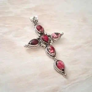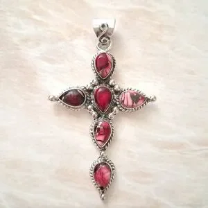 Artisan Handmade Red Rose Dahlia Turquoise 925 Sterling Silver Cross Pendant