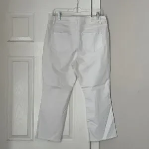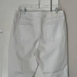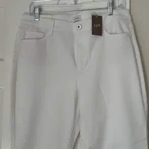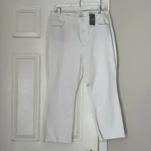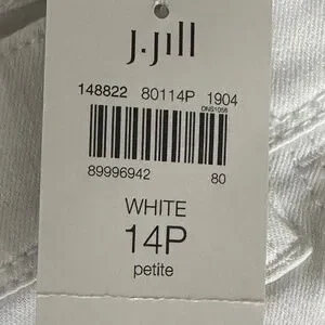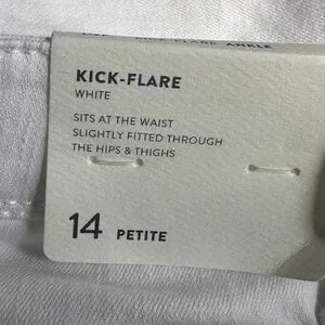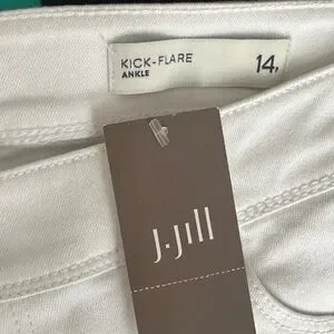 Brand new J. Jill Kick Flare White jeans, Size 14 Petite. Ankle length pant. Sits at the waist, and is slightly fitted through the hips and thighs. Raw hem at the bottom. Perfect for all year round wear. Cotton blend.