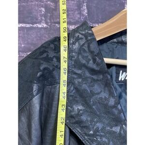 A striking Winlit black genuine leather long trench coat. This elegant outerwear piece showcases embossed detailing on the collar and cuffs, adding a touch of sophisticated texture to the smooth leather. Designed for a flattering silhouette, the coat features a classic trench style with a button front and tailored pockets. Ideal for layering over evening wear or adding a polished finish to a daytime outfit.