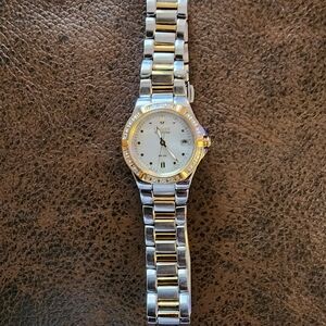 Stylish Citizen Ecodrive watch with a two-tone design. Features mother of pearl face and diamond accents and a sleek face.