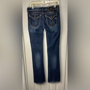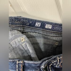Pre owned Miss Me Jeans, distressing on the front cream and brown stitching folded back pockets with a bootcut fit. Size 28, waist laid flat 14.5 inches, rise 8 inches, inseam 32.5 inches. Some wear to bottom hem otherwise In good used condition, 98% cotton 2% elastane.
