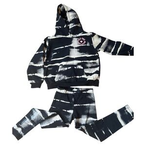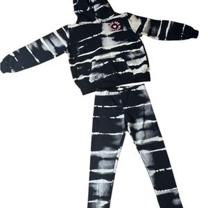 Stylish Girls h&M black and white tie-dye hoodie and joggers set size 6-7a. Features a unique design with a pink heart detail. Excellent condition, smoke-free home.