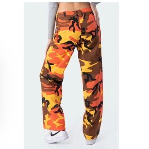 Bold camouflage cargo pants with multiple pockets. Features a striking mix of orange, yellow, and black colors.