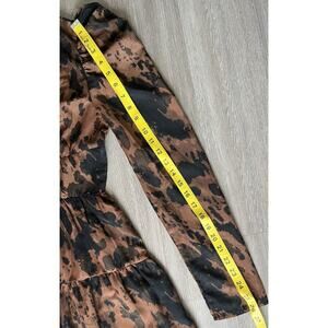 Brown and black abstract animal-style print, long sleeves, deep V-neckline, and ruffle hem.